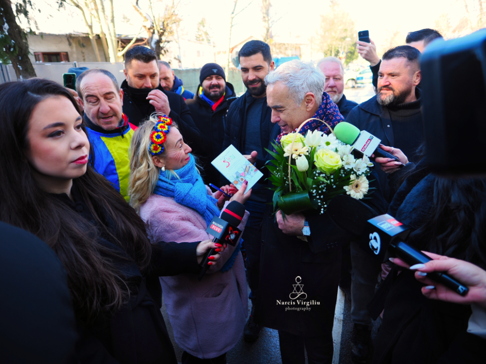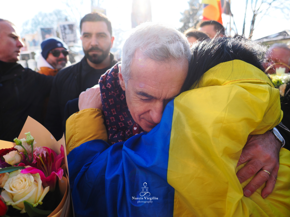 Are mâini ridate și palme calde, are miros de iarnă și de steag purtat prea mult timp aproape de inimă. O femeie dintr-o generație care a învățat să rabde îl cuprinde pe omul ales de mii de alte inimi, ca pe un fiu întors acasă. Nu este politică aici. Este recunoaștere. Este bătaia unei inimi în piept care radiază iubire…