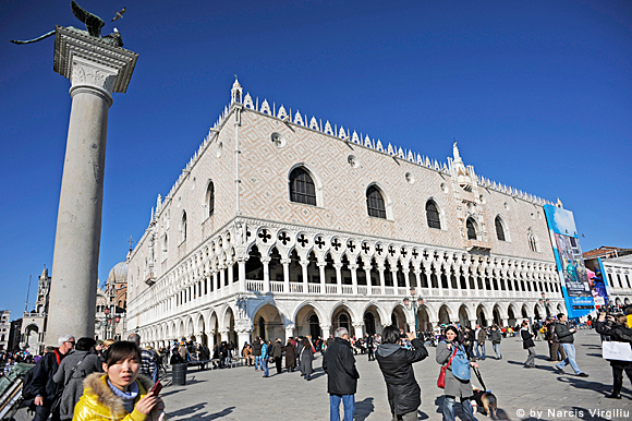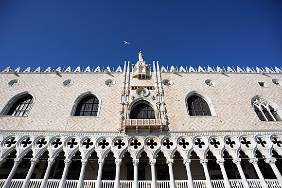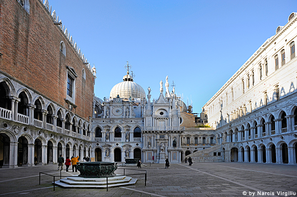 • Palazzo Ducale sau Palatul Dogilor care timp de aproape o mie de ani a fost resedinta dogilor care au condus Venetia si nu numai ci si a politiei secrete, a Curtii de Justitie si a altor multor institutii administrative. O cladire senzationala cu o arhitectura gotica avand la exterior o superba combinatie de coloane complicat ornamentate cu motive decorative de trifoi cu patru foi.