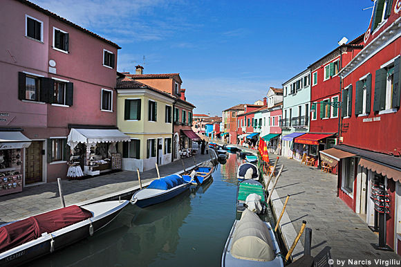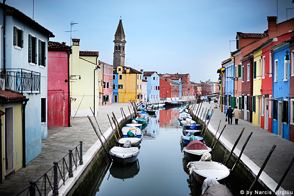 Daca insula Murano ne-a fermecat datorita celebrei sticle produse, Burano ne-a oferit o priveliste intr-o multitudine de culori cu care erau zugravite casele. Se spune ca acest lucru reprezenta o traditie, fiecare pescar alegandu-si o alta culoare fata de casele vecine pentru a si-o recunoaste din larg la intoarcerea acasa. Burano este recunoscuta pentru dantela sa care se produce inca din secolul XV-lea. Din nefericire astazi marea majoritate a dantelelor expuse la vanzare sunt fabricate in China, pe insula ramanand cateva batrane care mai produc superbele dantele carora li se mai spune si “puncte in aer”.
